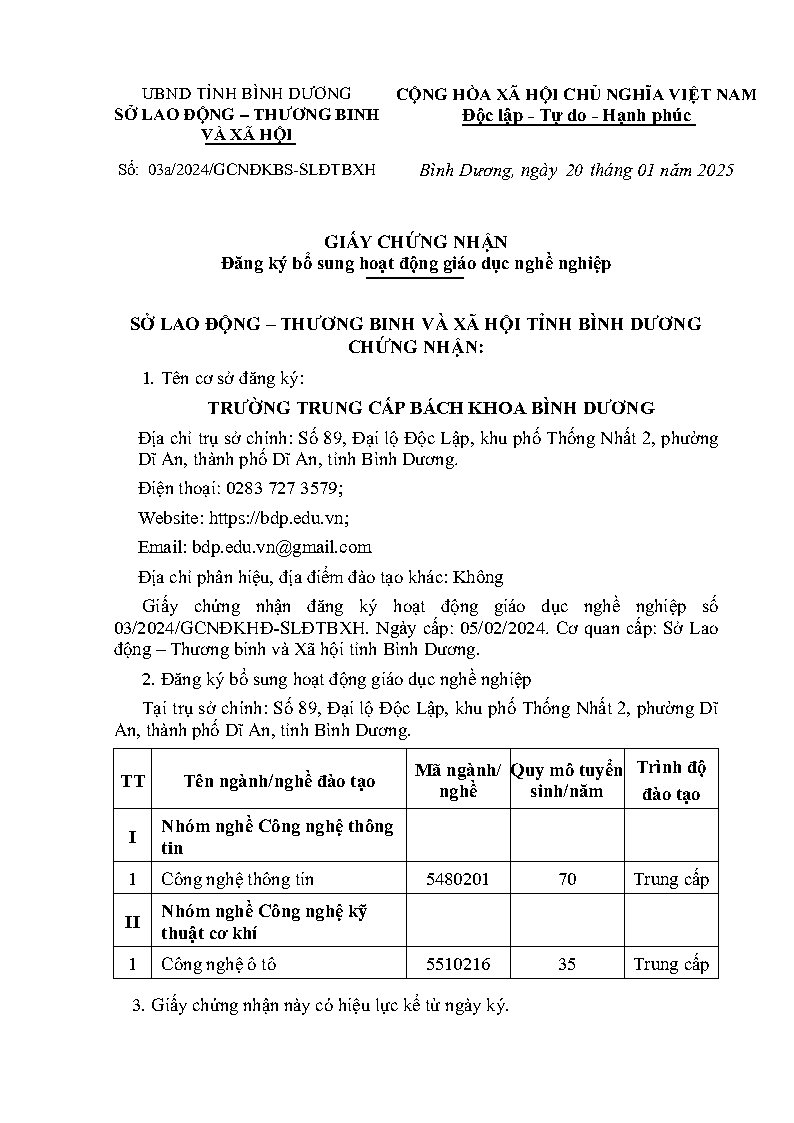 GCN HOẠT ĐỘNG GDNNGiấy chứng nhận đăng ký hoạt động GDNN và bổ sung 1. Giấy chứng nhận đăng ký hoạt động giáo dục nghề nghiệp 2. Giấy chứng nhận đăng ký bổ sung hoạt động giáo dục nghề nghiệp Kỹ thuật công nghệ ô tô Báo cáo đăng ký bổ sung hoạt động giáo dục nghề nghiệp